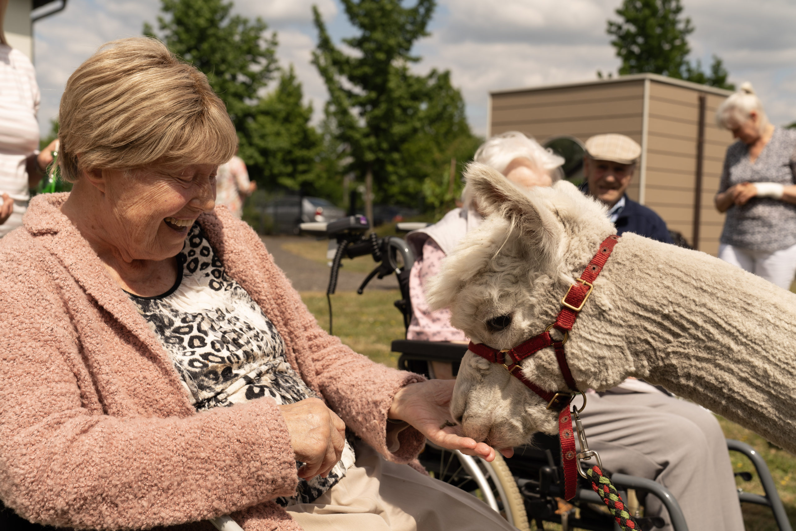 Ich fühle mich hier pudelwohl. Und das schon seit nahezu 9 Jahren. Erst als Service-Bewohnerin und jetzt in der stationären Pflege. Und hier haben sie ganz verrückte Ideen: Zuletzt hatten wir Besuch von zwei Alpakas.